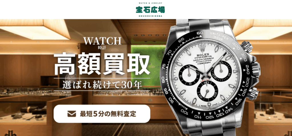宝石広場は、高級時計・宝石の販売と買取を専門に行っている老舗企業です。特にロレックス、パテック・フィリップ、オーデマ・ピゲなどの超高級時計の取り扱いに長けており、コレクター向けの希少モデルや限定品の査定において、他社では評価が難しいような時計でも適正な価格を提示してくれることで定評があります。
